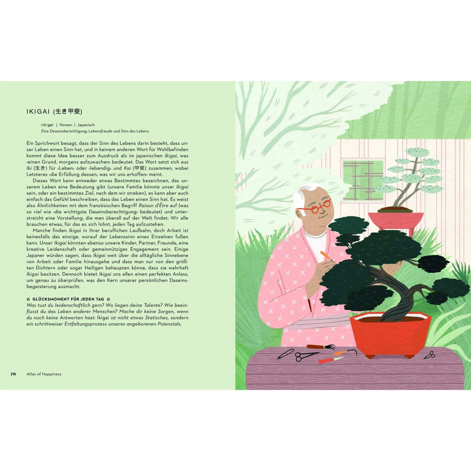 Der Atlas of Happiness lässt den Leser in die Kulturen der Welt eintauchen und lehrt dabei Lektionen für mehr Glück und Zufriedenheit im eigenen Leben. Die mitunter schwer fassbaren Begriffe werden von erzählerischen Illustrationen veranschaulicht.