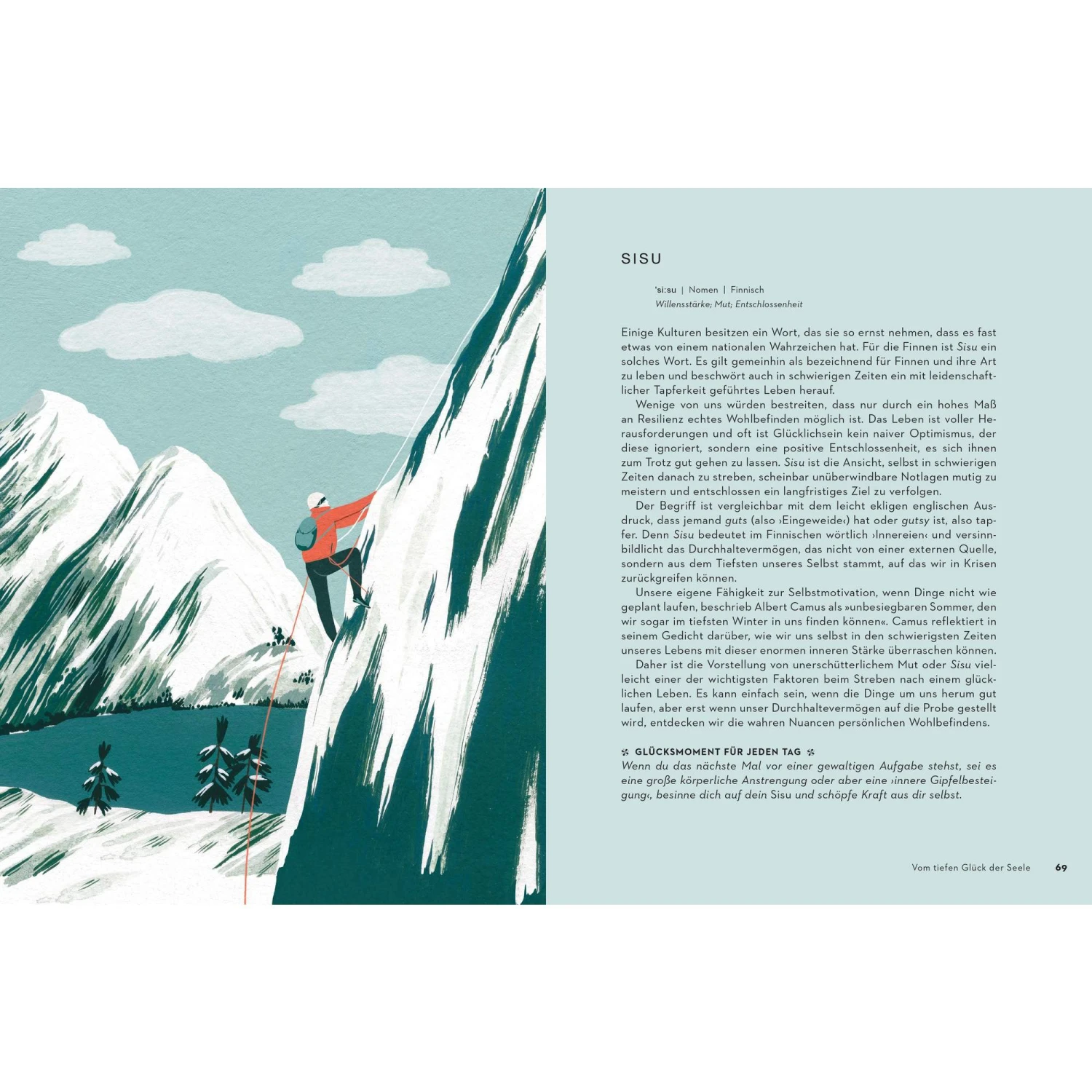 Anhand von 50 Begriffen aus bekannten Sprachen aber auch unbekannten Dialekten werden verschiedenste Konzepte vorgestellt, die den zutiefst menschlichen Wunsch ansprechen, ein glückliches Leben zu führen.