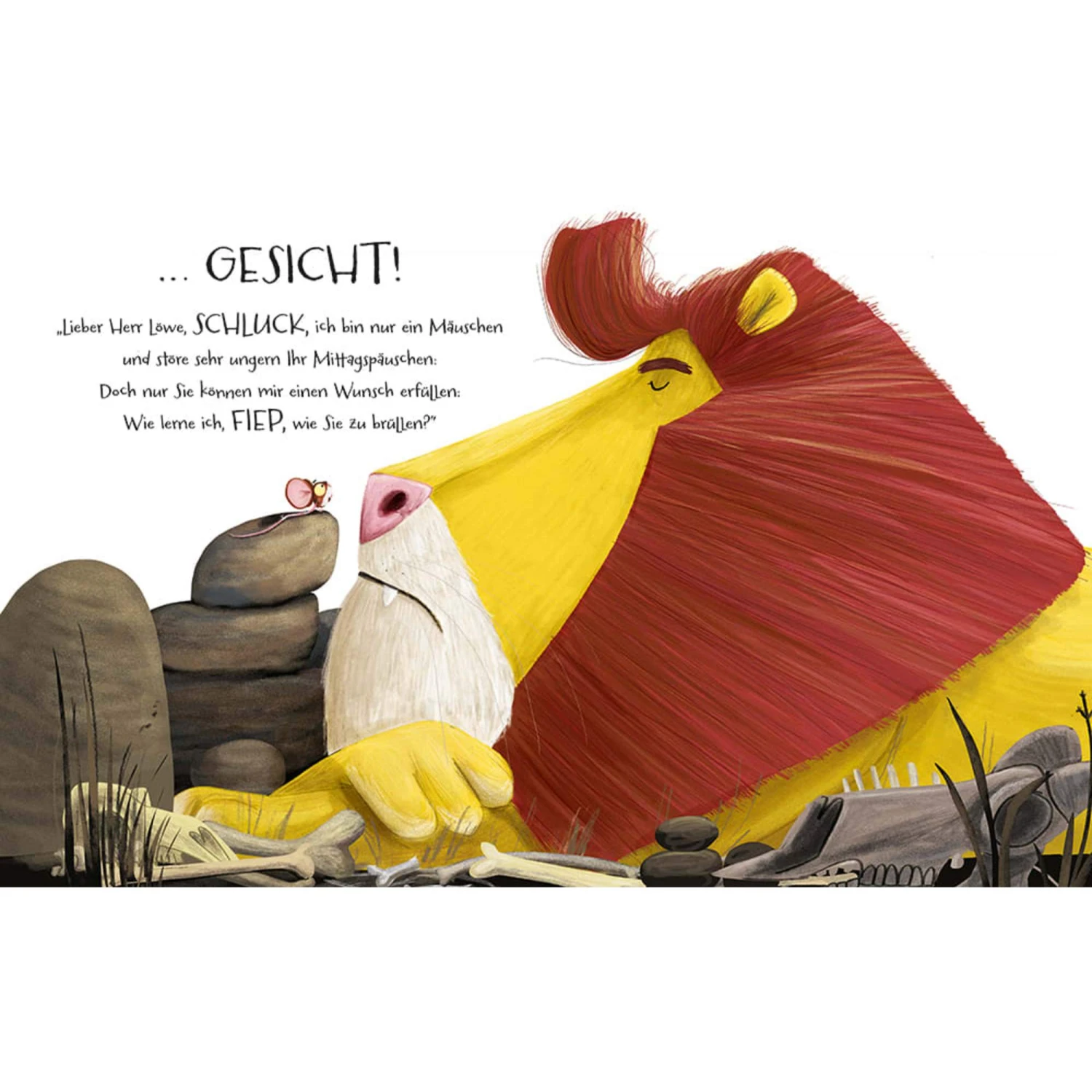 Klein zu sein ist nicht immer einfach. Wer könnte das besser wissen als die Maus? Man wird vergessen, übersehen und geschubst. Doch eines Tages hat die Maus die Nase voll! Wenn sie doch nur so brüllen könnte wie der Löwe, dann würde ihr das nicht mehr passieren! Sie fasst all ihren Mut zusammen und beschließt, den mächtigen Löwen zu besuchen. Denn wer könnte ihr das Brüllen besser beibringen als der Löwe höchstpersönlich? Am Ende ihrer abenteuerlichen Reise macht die Maus eine Entdeckung: Man muss gar nicht groß und stark sein, um seine eigene Stimme zu finden.