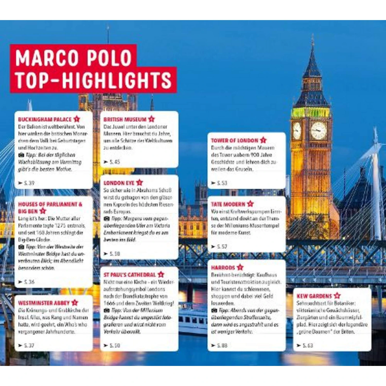 Das Beste zuerst: Tipps für Regenwetter, Urlaub mit Kindern und Low-Budget-Ausflüge Erlebnistouren durch die spannendsten Stadtviertel abseits der Touristen-Hotspots: schnell und unkompliziert mit dem praktischen Stadtplan zum Ausklappen Shoppen oder Party? Beides! Mit den MARCO POLO Insider-Tipps findest du die beliebtesten Einkaufstempel und Ausgeh-Hotspots der Londoner Urlaubsstimmung schon vor der Anreise: mit Musik-Playlists, Buch- und Filmtipps für deinen London-Trip