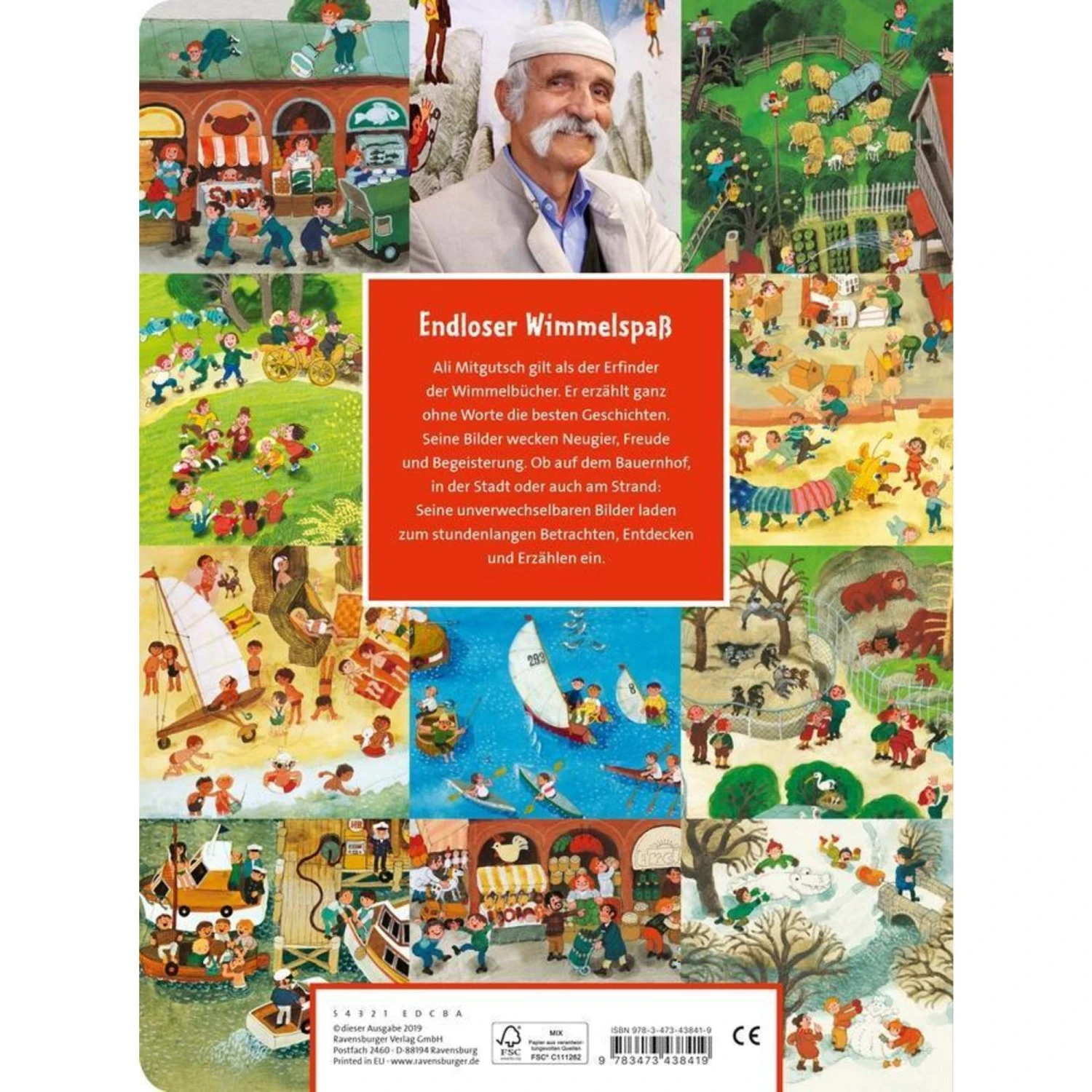 Endloser Bilderbuchspaß für alle großen und kleinen Ali Mitgutsch Fans! Ali Mitgutsch versteht es wie kein anderer, Geschichten ganz ohne Worte zu erzählen und zieht mit seinen Wimmelbüchern seit Generationen Kinder in seinen Bann. Diese Jubiläumsausgabe führt Kinder anhand bunter Wimmelbilder auf den Bauernhof, ans Wasser, in den Zoo, auf eine Baustelle, in die Berge und an viele weitere Orte mehr. Überall gibt es viele lustige Details zu entdecken. Das macht Spaß und hilft beim Sprechen lernen!