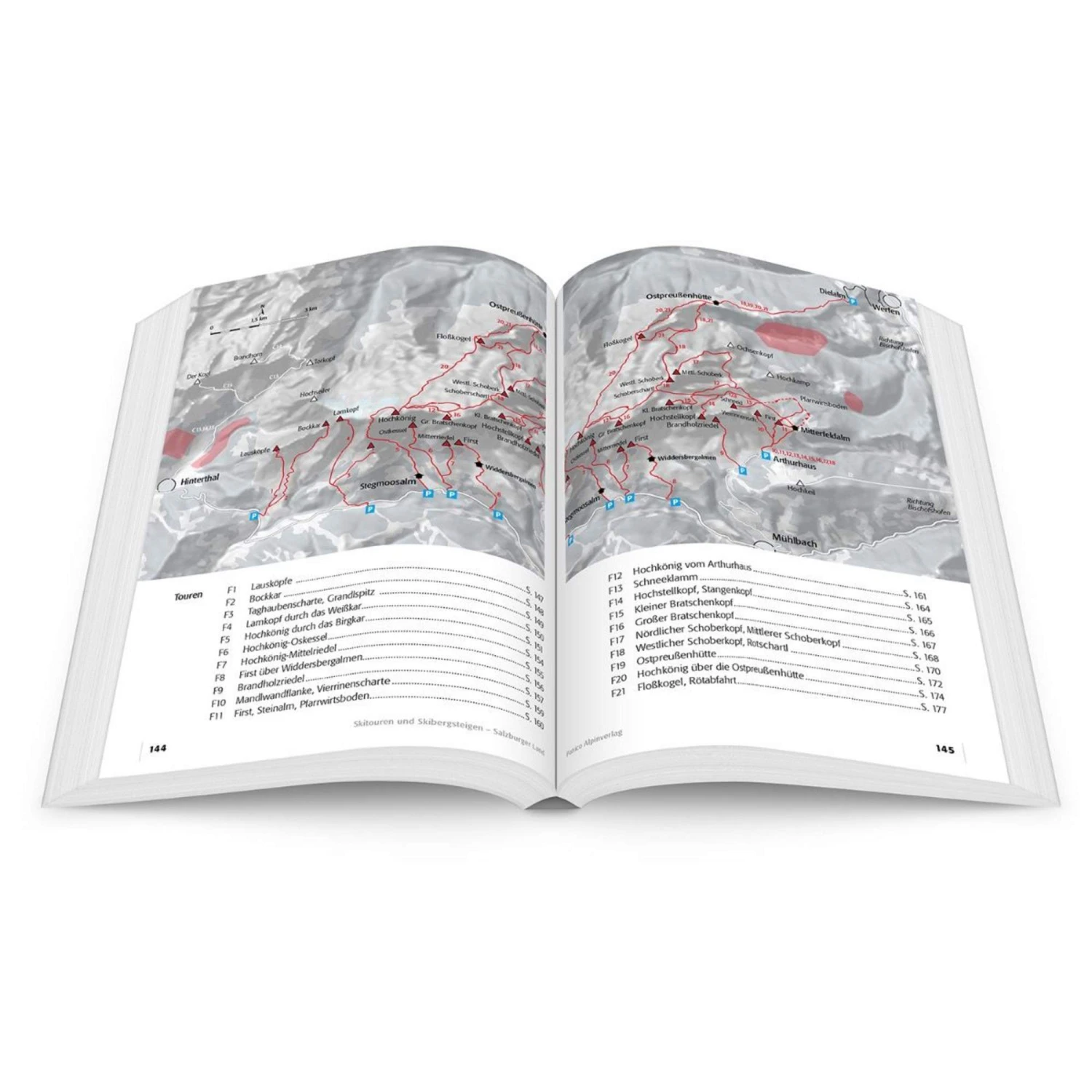 Das eigentliche Skitourenparadies beginnt allerdings erst einige Kilometer südlich. Den Einstieg vermitteln die eher voralpin geformten Berge der Osterhorngruppe, wo vor allem Skitourenanfänger und -genießer auf ihre Kosten kommen. Hinter diesen Vorbergen baut sich die eindrucksvolle Barriere der Nördlichen Kalkalpen auf, die vom Gosaukamm über das Tennengebirge und das Hagengebirge bis zum Hochkönig reicht – weiter im Westen schließen dann die nicht weniger imposanten Gipfel des Steinernen Meeres sowie der Loferer und Leoganger Steinberge an.